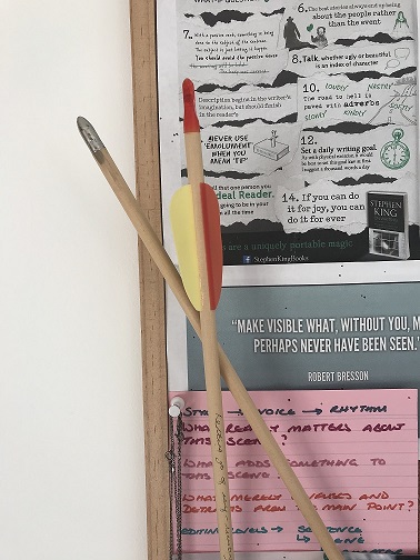 I love my study so much. We moved to a new house nine months ago and I finally have my own room to write in (instead of writing with my laptop on my knee in bed) Above the desk is a notice board where I pin ideas and pictures. Down one long white wall I have post-it notes showing scenes for book 3 and how they fit into each act. It’s by far my favourite room in the house.