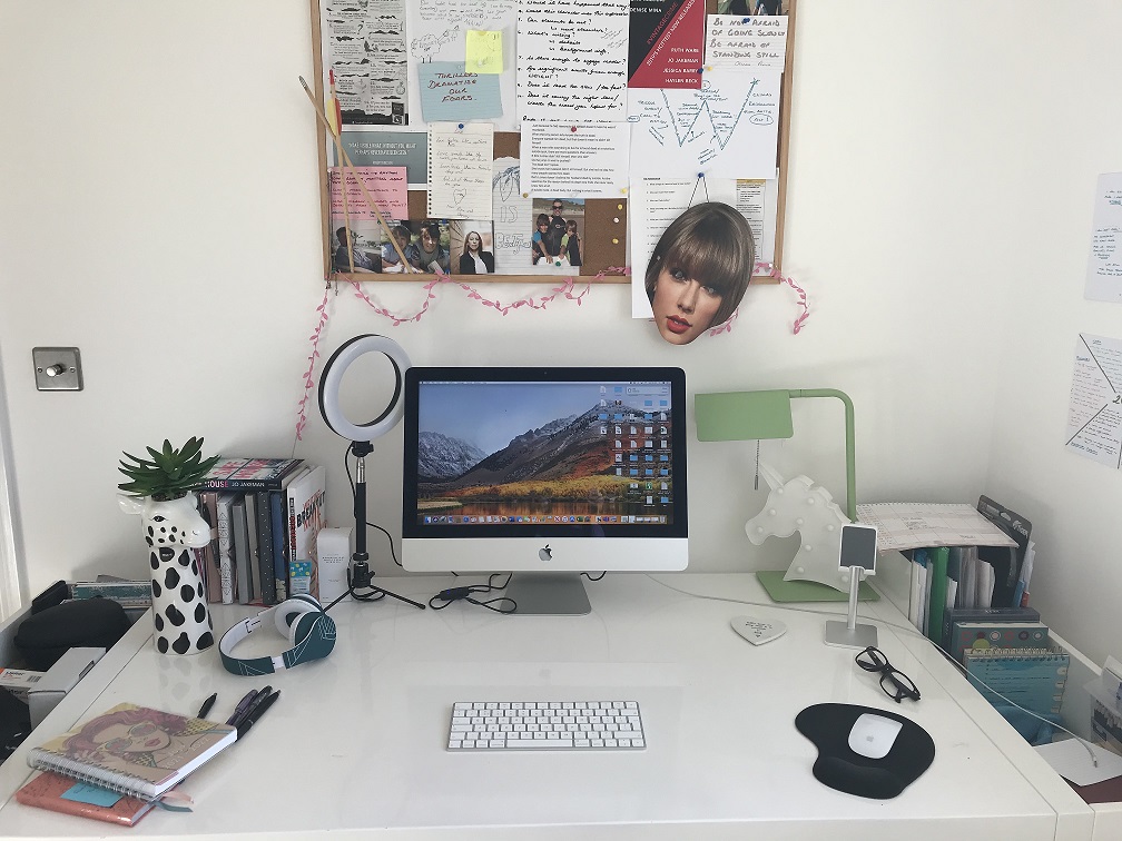 Mostly my desk is a random collection of things from a giraffe plant pot to a Taylor Swift face mask, with many pretty notebooks in between. BUT I also have a broken arrow above my desk. I have the most amazing mentor who has helped me with my confidence. Last year we were able to get together and break arrows on our throats. Yes, throats!! I wrote my self-limiting beliefs on it, put the metal tip against my throat and walked towards my mentor, breaking the arrow in half. Trust me, this is not the kind of thing I would normally do, in fact I stood on the beach, where we were doing this in the rain, thinking ‘what on earth have I got myself into’. But it was indescribably moving and I felt so calm afterwards. It’s there as a powerful reminder than I can put my mind to anything.