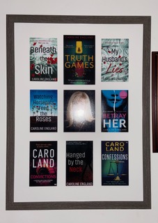 Hung on the wall behind me is a huge frame with all my book covers beautifully displayed in it. My husband is particularly proud of it because he thought of and sourced it all by himself last Christmas, instead of relying on one of our three daughters to suggest something!